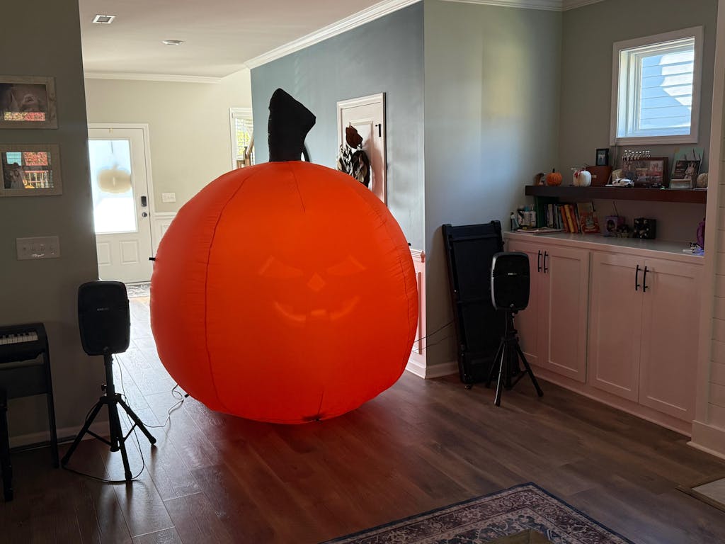 I inflated my pumpkin inside to set it up. The set up wasn't bad but it does need to be updated. I am definitely getting another one next year so they can talk to eachother. This year will be so much fun!